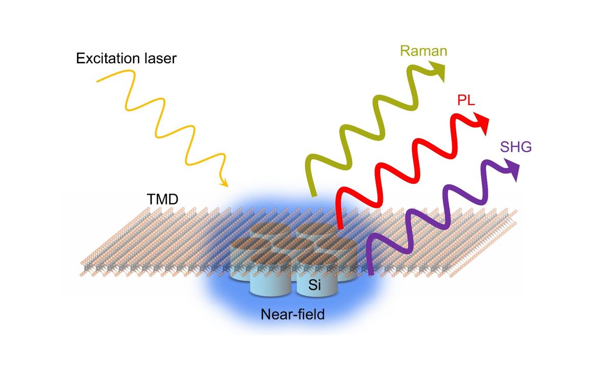 Researchers from IESL/FORTH, in collaboration with international partners from CEMES, LAAS, INSA, CNRS (France) and Universität Darmstadt (Germany), demonstrate that silicon nanoantennas can dramatically enhance the optical response of atomically thin semiconductors. By coupling monolayer MoS2 to resonant silicon nanostructures, they achieved up to a 30-fold enhancement in second-harmonic generation, together with significant increases in photoluminescence and Raman efficiencies. This study also disentangles the distinct physical origins of enhancement across different optical processes, paving the way for next-generation nanophotonic and quantum technologies.