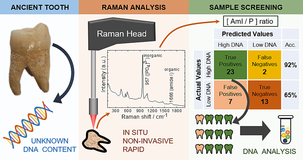 As detailed in the article by A Philippidis et al, screening is achieved on the basis of a simple molecular index, the amide-to-phosphate ratio (Am-I/P), extracted from key vibrational bands in the Raman spectra, which serves as a proxy of the dental tissue protein content (typically collagen) relative to hydroxyapatite, namely the inorganic matrix. Analysis is performed, non-invasively, directly on intact teeth, by use of a compact, mobile micro-Raman spectrometer, focusing the laser probe on the cementum part, known to be protein rich. Ancient DNA analysis showed that teeth found to preserve endogenous human DNA, to a reasonable degree, showed indeed a good statistical correlation with the ones identified to be protein-rich based on the Am-I/P.