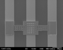 Acoustic sensors: For over a decade, MRG has been developing SAWs, Film bulk acoustic resonators (FBARs) mainly for temperature, pressure and humidity sensing, Lamb resonators for biosensing (e.g. protein detection) and UV photodetectors. Key parameters are the developed micromachining process for extremely thin GaN membranes (below 500nm) and the electron beam lithography protocols for extremely narrow and densely packed interdigitated transducers (IDTs) as thin as 100nm with 100nm period.